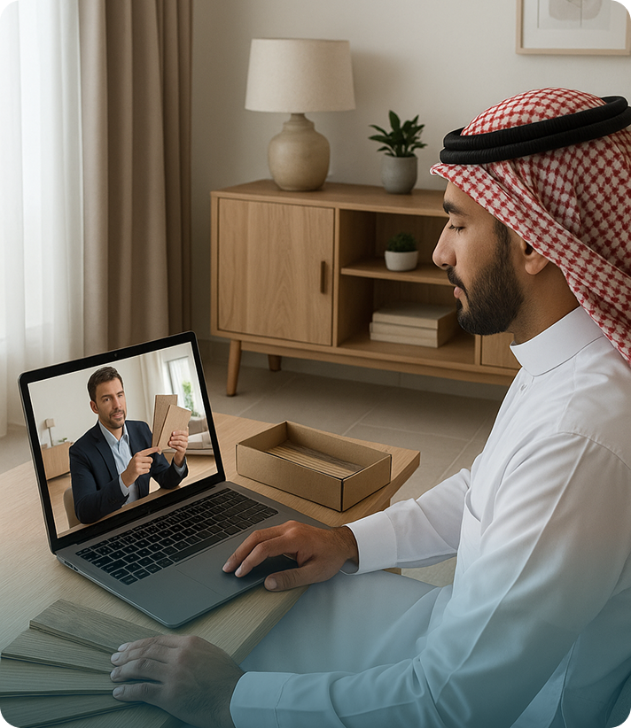 تتفرج على عينات الباركيه مباشرة من المعرض خلال الجلسة الأونلاين، كأنك واقف داخل المعرض بالضبط — بدون ما تطلع من بيتك!
